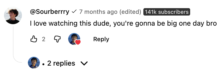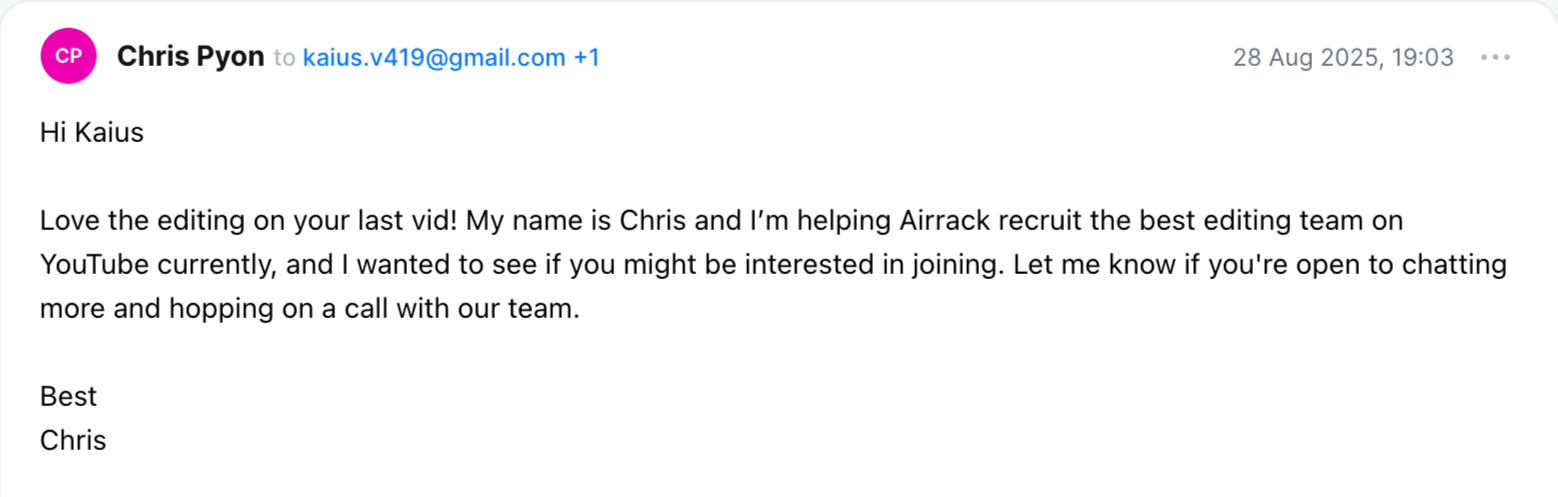 I run a passion-fuelled Youtube channel, where I stretch my filmmaking by attempting a range of challenges, which has received positivity from some of the platform’s largest creators, including a cold-email from YouTuber Airrack (17M+ subscribers). See below.